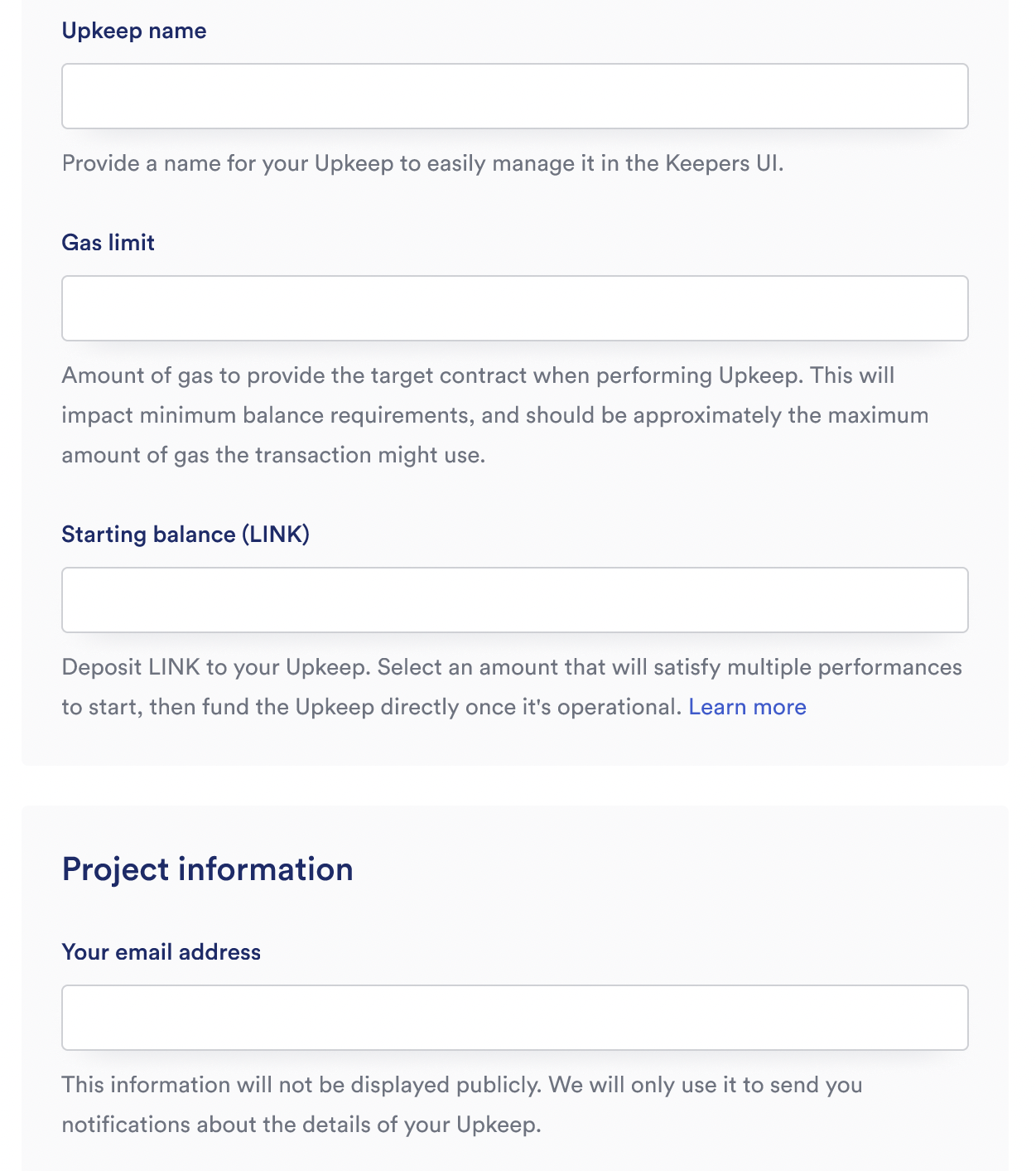 • Starting balance (LINK): Specify a LINK starting balance to fund your upkeep. See the LINK Token Contracts page to find the correct contract address and access faucets for testnet LINK. This field is required. You must have LINK before you can use the Chainlink Automation service.